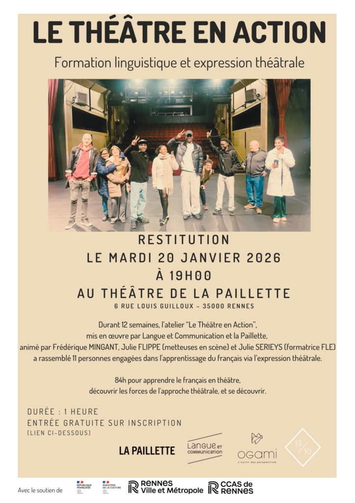 Ils et elles ont travaillé d’arrache pied et sont fièr·e·s de vous présenter leur travail lors d’un spectacle restitution le mardi 20 janvier 2026 à 19h, au théâtre de la Paillette. Ils et elles, ce sont les apprenant·e·s de français langue étrangère qui ont été accompagnés pendant 3 mois par une formatrice de FLE (français langue étrangère) et 2 metteuses en scène de la compagnie 13/10è en Ut pour apprendre le français à travers la pratique du théâtre. Une expérience inoubliable pour toutes et tous, hébergée à la Paillette, que nous remercions chaleureusement pour leur accueil, ainsi que tous·tes les participant·e·s et les accompagnatrices pour leur engagement dans ce projet riche de sens.